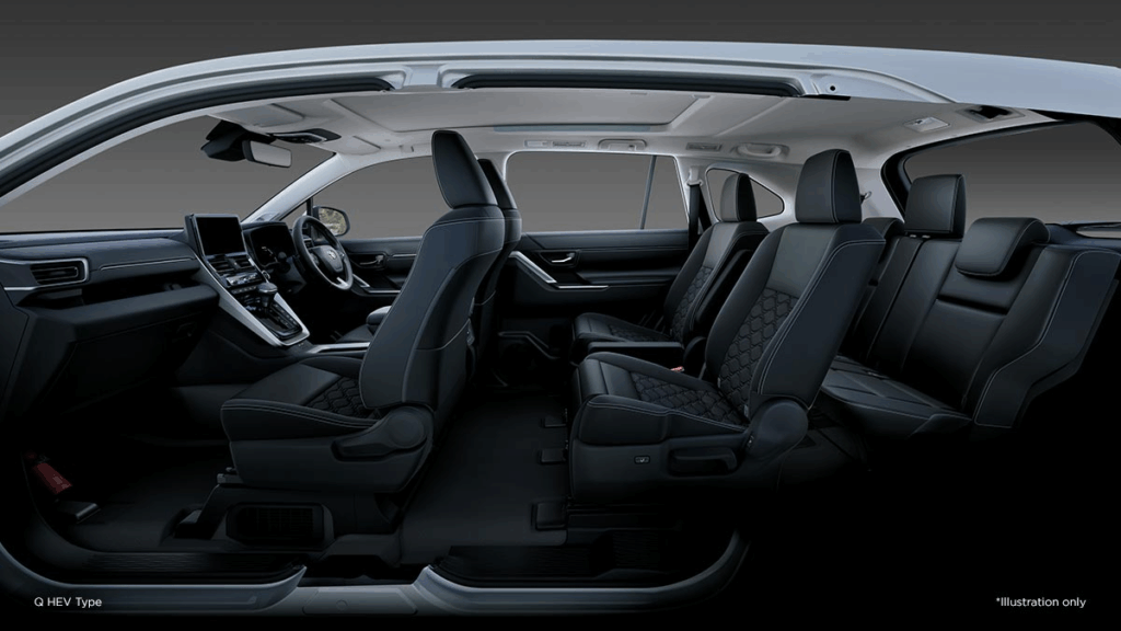 Interiornya mewah. Kursi kulit, AC dual zone bikin adem. Layar sentuh 10 inci dukung Apple CarPlay. Audio JBL bikin musik hidup. Fitur keselamatan top, ada Toyota Safety Sense. Termasuk rem otomatis, lane assist, dan blind spot monitor. Bagasi luas, muat koper banyak. Pintu geser elektrik ramah anak dan lansia.